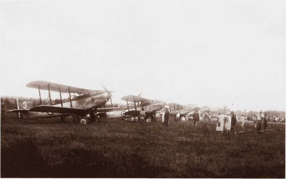 By 1920 the "Cape to Cairo" dream of a railway running the length of Africa was about to be eclipsed by aviation. About the same time as Sir Alan Cobham was surveying a route for Imperial Airways to use from Cairo to Cape Town, a little-known flight by four Fairey 3111 D's based at RAF Northolt took place. Between March and May 1926 they flew a return trip from Egypt to South Africa. Shown in this unique photo are the four planes parked at Ndola Airfield. Among the pilots is Wing Commander C. Pullford explaining that the purpose of the flights was to gain experience in long-haul formation flying!