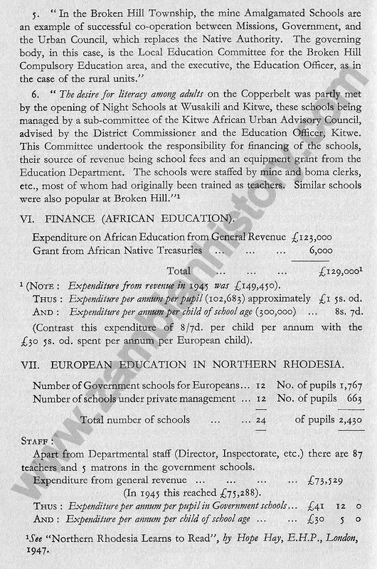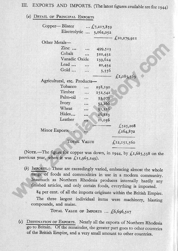 After 1933 the situation slowly improved. In that year the Territory produced minerals valued at £3,845,560 more than seven-eights of which accrued from copper. And since those troubled years of depression and struggle for survival, the fate and fortunes of Northern Rhodesia have been bound up in the Territory's copper mining industry. Strenuous efforts have been and are still being made byGovernment to build up a more balanced economy, so that if another depression does result in a fall in mineral prices, Northern Rhodesia will not be dependent entirely on her copper resources.