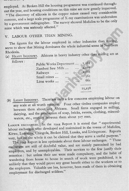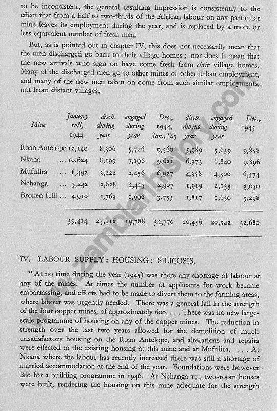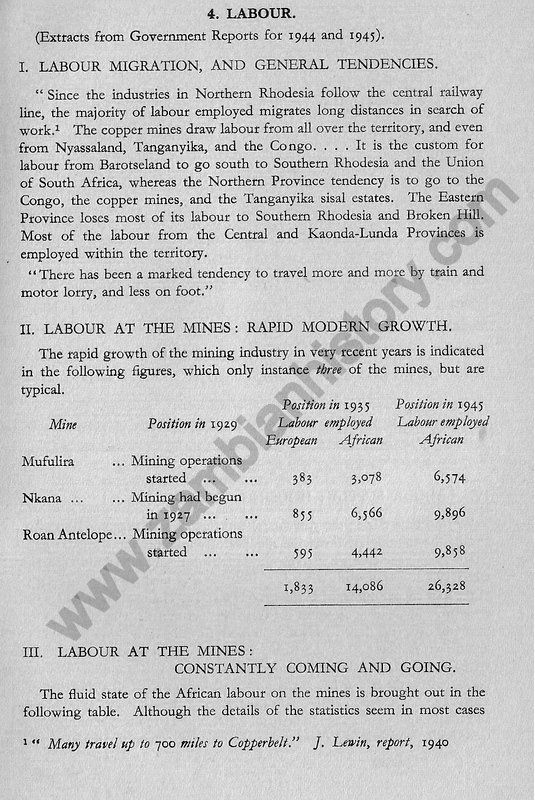 Consider briefly the history of the last twenty years.In 1925 rich deposits of copper sulphide ore are found in a smallish area of a province of Northern Rhodesia, almost on the border of Belgian Congo. At several points mines are started, and by 1930 the "mushroom" growth of this copper rush involves some 30,000 uneducated tribal African labourers, swept up from all over a huge territory, herded together in improvised temporary compounds, and engaged in the erection of huge modern electrical and mechanical constructions, in the midst of what was until then the silent, untouched and inaccessible African forest. "Ndola...looked forward to becoming a second Johannesburg: trade flourished and almost unlimited credits was given." Then slump. Price of copper fell from £72 to £27, mines closed down altogether, or their development was arrested; despair, dismissal of both Europeans and Africans, till the latter fell from the 30,000 figure to less than 7,000 in 1932. The following year brought as sudden revival. Mines were re-opened, others went into production for the first time. The war increased the demand for copper; and in 1943, eighteen years after the discovery of ore, the four larger mines employed (directly in actual mining operations) over 34,000 Africans and about a tenth of that number of Europeans, and the copper exported from Northern Rhodesia, nearly all to Britain, reached the value of £11,965,249.
