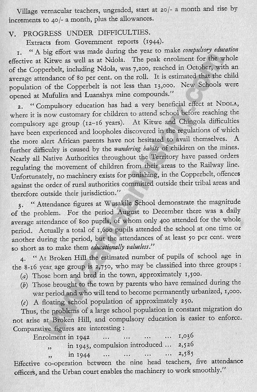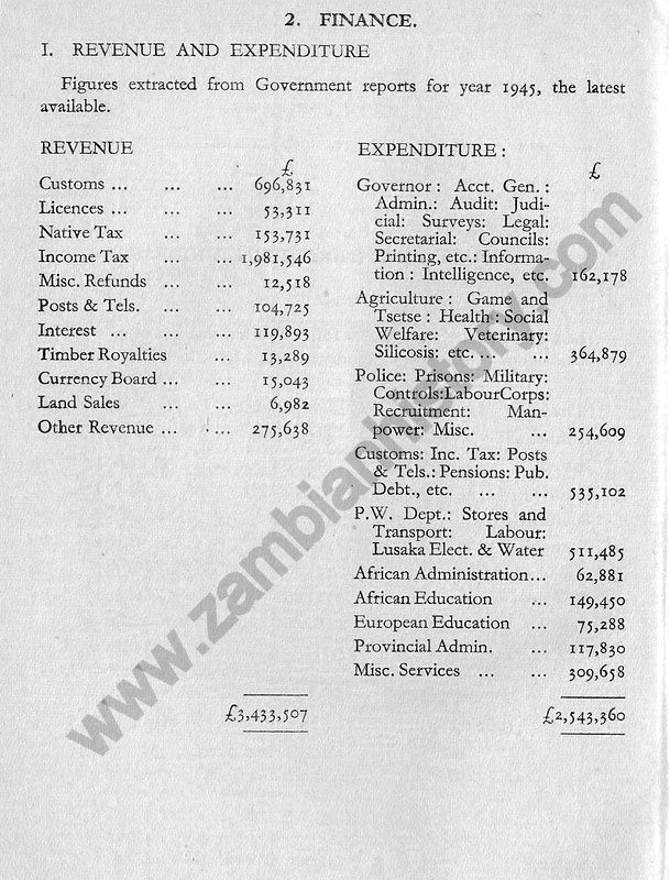 After 1933 the situation slowly improved. In that year the Territory produced minerals valued at £3,845,560 more than seven-eights of which accrued from copper. And since those troubled years of depression and struggle for survival, the fate and fortunes of Northern Rhodesia have been bound up in the Territory's copper mining industry. Strenuous efforts have been and are still being made byGovernment to build up a more balanced economy, so that if another depression does result in a fall in mineral prices, Northern Rhodesia will not be dependent entirely on her copper resources.