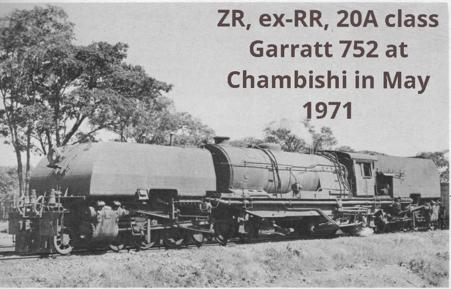 Steam activity on the main line came to an end in mid-1971, when the second batch of diesels was delivered from General Electric of the USA, and is now confined, it is believed, to less than a dozen engines in the Livingstone area, where 20th/20A class Garratts are used for shunting and for trip-working to the Victoria Falls bridge, and 12th class engines work the former Zambesi Saw Mills Railway. This line was taken over by ZR in 1972 but most of its famous collection of ancient ex-RR locomotives are still dumped at its sheds in Livingstone and Mulobezi.